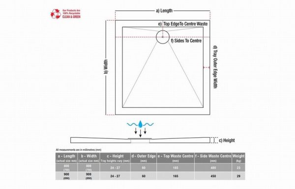 25mm Anti-Slip Ultra-Slim 900mm Square Tray & Waste